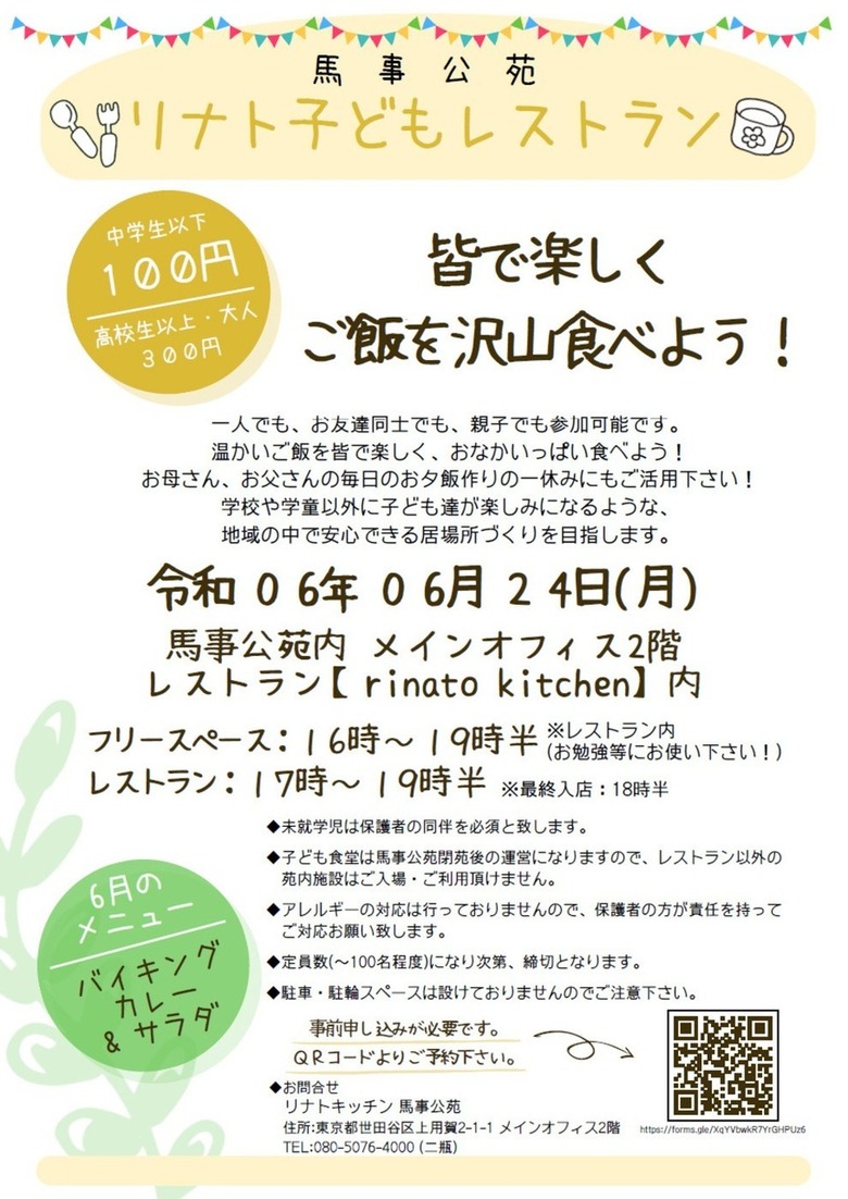 2024.06.07 馬事公苑 リナト子どもレストランの開催について リナトキッチン 馬事公苑において、6月24日(金)に子どもレストランを開催いたします。 詳細は下記チラシを確認後、QRコードの予約フォームからご予約下さい。 予約締切日:6月21日(金) ※定員数に達した場合、締切とさせて頂きます。 ご来店お待ちしております。 お知らせ一覧へ戻る