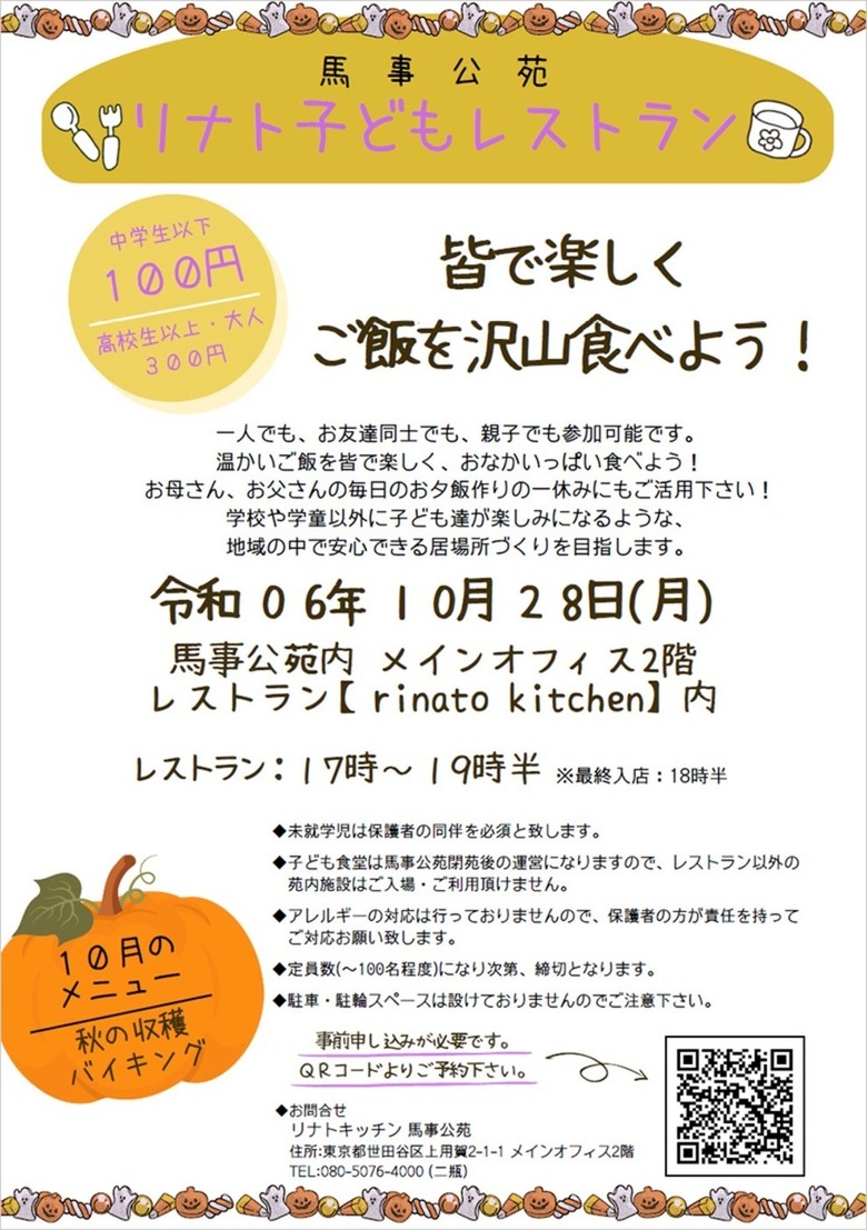 2024.10.16 馬事公苑 第4回リナト子どもレストランの開催について リナトキッチン 馬事公苑において、10月28日(月) に第4回子どもレストランを開催いたします。 詳細は下記チラシを確認後、QRコードの予約フォーム、またはこちらからご予約下さい。 予約締切日:10月25日(金) ※定員数に達した場合、締切とさせて頂きます。 ご来店お待ちしております。 お知らせ一覧へ戻る